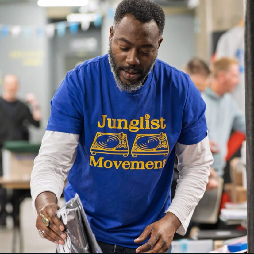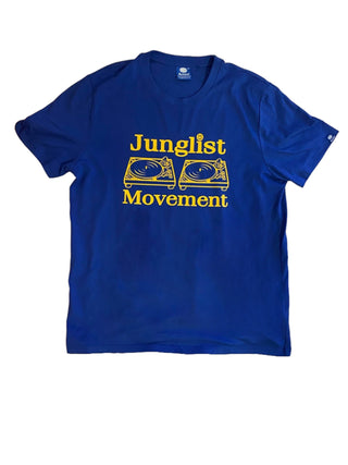 Mens 100% Cotton Heavyweight Junglist Movement T-shirt in Royal Blue with Yellow Print.